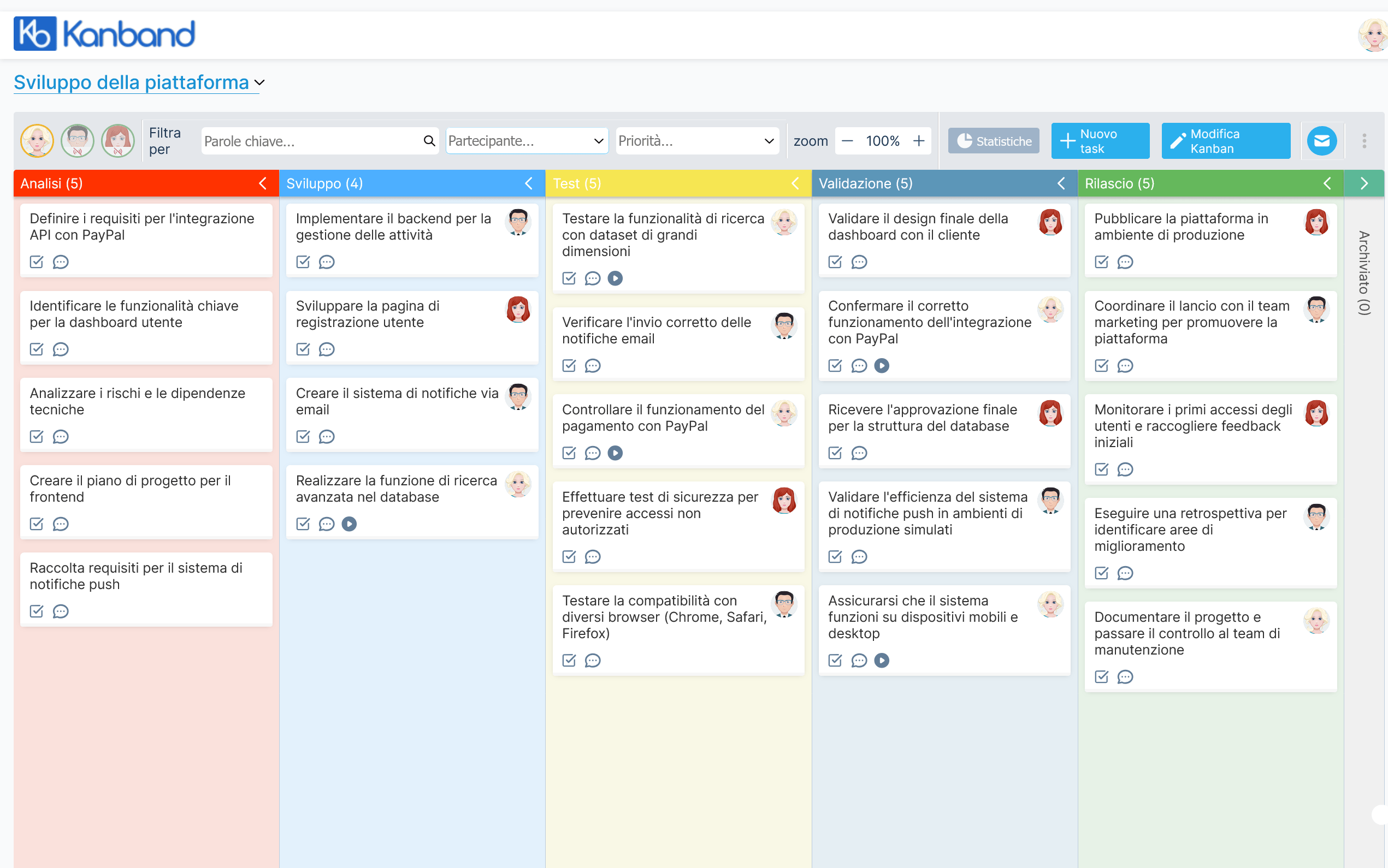 - Rilascio: in questa colonna infine potrebbero essere inseriti i moduli terminati, validati e che sono stati rilasciati al cliente.